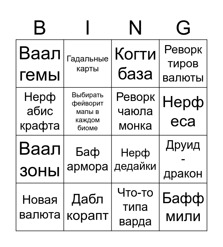 This bingo card has 16 words: Дабл корапт, Друид - дракон, Когти база, Ваал гемы, Ваал зоны, Гадальные карты, Нерф дедайки, Что-то типа варда, Нерф абис крафта, Выбирать фейворит мапы в каждом биоме, Новая валюта, Реворк тиров валюты, Баф армора, Нерф еса, Реворк чаюла монка and Бафф мили.