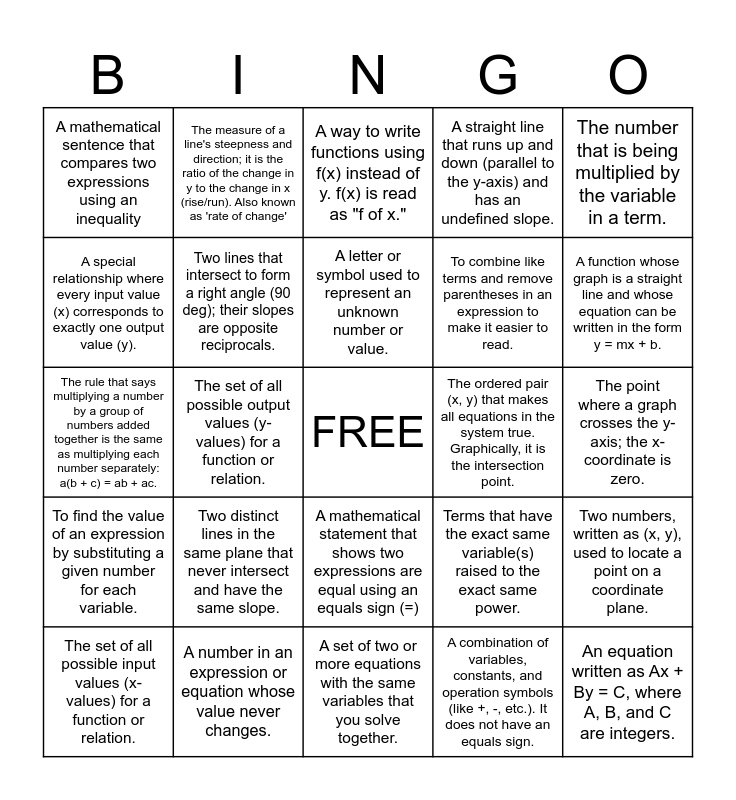 This bingo card has a free space and 26 words: A mathematical statement that shows two expressions are equal using an equals sign (=), A combination of variables, constants, and operation symbols (like +, -, etc.). It does not have an equals sign., A letter or symbol used to represent an unknown number or value., A number in an expression or equation whose value never changes., The number that is being multiplied by the variable in a term., A mathematical sentence that compares two expressions using an inequality, A special relationship where every input value (x) corresponds to exactly one output value (y)., The measure of a line's steepness and direction; it is the ratio of the change in y to the change in x (rise/run). Also known as 'rate of change', The point where a graph crosses the y-axis; the x-coordinate is zero., Terms that have the exact same variable(s) raised to the exact same power., To combine like terms and remove parentheses in an expression to make it easier to read., The rule that says multiplying a number by a group of numbers added together is the same as multiplying each number separately: a(b + c) = ab + ac., Two numbers, written as (x, y), used to locate a point on a coordinate plane., The set of all possible input values (x-values) for a function or relation., The set of all possible output values (y-values) for a function or relation., A straight line that runs left and right (parallel to the x-axis) and has a slope of zero., A straight line that runs up and down (parallel to the y-axis) and has an undefined slope., To find the value of an expression by substituting a given number for each variable., A way to write functions using f(x) instead of y. f(x) is read as "f of x.", An equation written as Ax + By = C, where A, B, and C are integers., A function whose graph is a straight line and whose equation can be written in the form y = mx + b., A set of two or more equations with the same variables that you solve together., The ordered pair (x, y) that makes all equations in the system true. Graphically, it is the intersection point., Two distinct lines in the same plane that never intersect and have the same slope., Two lines that intersect to form a right angle (90 deg); their slopes are opposite reciprocals. and The point where a graph crosses the x-axis; the y-coordinate is zero..