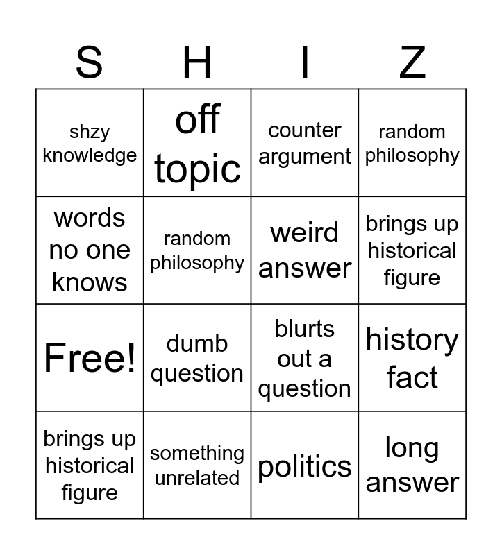 This bingo card has 20 words: history fact, yap sesh, counter argument, Hakim vs shizy, brings up historical figure, words no one knows, something unrelated, shzy knowledge, Free!, off topic, dumb question, blurts out a question, random philosophy, long answer, weird answer, everyone laughs, brings up historical figure, random philosophy, politics and class laughs.