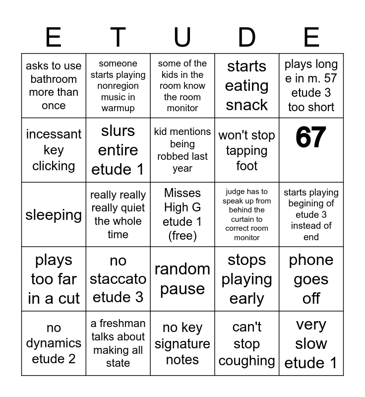 This bingo card has a free space and 34 words: kid who looks like a gooner is actually really good, can't stop coughing, audible fart, playes etude 2 too fast, plays too far in a cut, slurs entire etude 1, plays long e in m. 57 etude 3 too short, no dynamics etude 2, someone starts playing nonregion music in warmup, Cen10 kid mentions being robbed at state, kid mentions being robbed last year, some of the kids in the room know the room monitor, block blast, Instagram reels/TikTok (Nathan doesn't count), judge has to speak up from behind the curtain to correct room monitor, 67, a freshman talks about making all state, sleeping, no staccato etude 3, stops playing early, random pause, outburst of laughing, asks to use bathroom more than once, starts playing begining of etude 3 instead of end, no key signature notes, very slow etude 1, starts eating snack, homework, won't stop tapping foot, incessant key clicking, really really really loud the whole time, really really really quiet the whole time, phone goes off and room monitor skips a 30 sec warmup period.