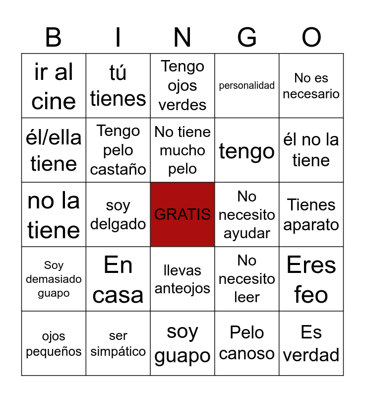 This bingo card has a free space and 31 words: soy guapo, soy alto, soy delgado, mujeres, ir al cine, Tengo ojos verdes, Tengo pelo castaño, No necesito leer, No necesito ayudar, Pelo canoso, Tienes aparato, Es verdad, gracioso, No necesito trabajar, él no la tiene, A mi lado, Eres feo, En casa, Soy demasiado guapo, llevas anteojos, No es necesario, él es calvo, ojos pequeños, tú tienes, tengo, él/ella tiene, personalidad, no la tiene, ser simpático, No tiene mucho pelo and Soy muy guapo.