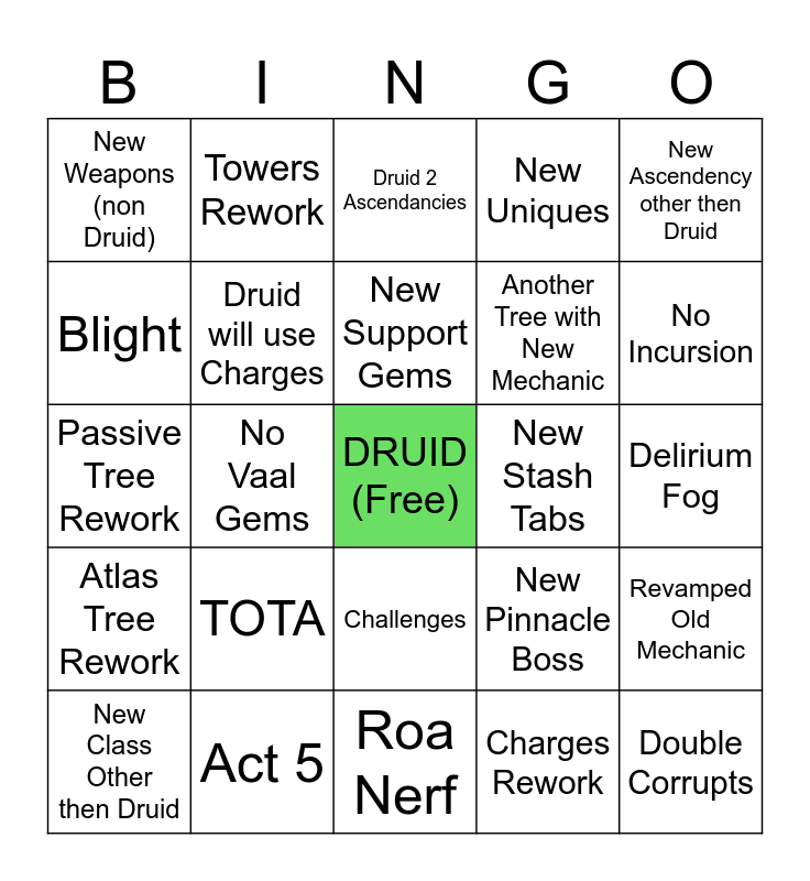 This bingo card has a free space and 24 words: TOTA, Act 5, New Support Gems, New Class Other then Druid, New Ascendency other then Druid, New Weapons (non Druid), Blight, Towers Rework, New Stash Tabs, Challenges, Another Tree with New Mechanic, Passive Tree Rework, New Pinnacle Boss, Revamped Old Mechanic, Druid will use Charges, Charges Rework, Delirium Fog, Druid 2 Ascendancies, No Incursion, No Vaal Gems, Double Corrupts, Atlas Tree Rework, New Uniques and Roa Nerf.