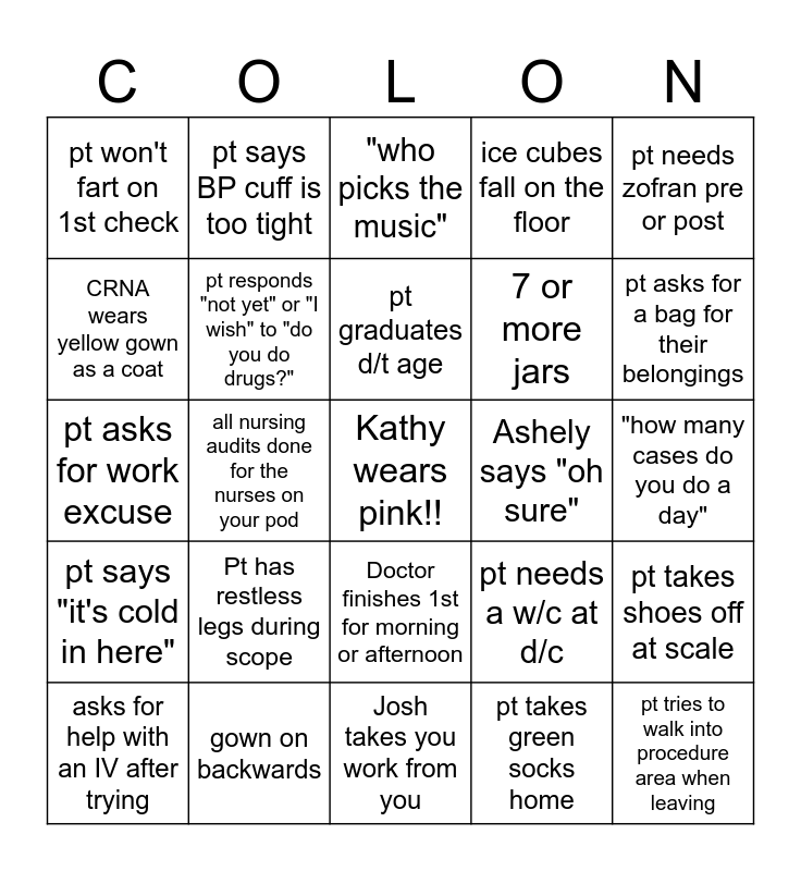 This bingo card has a free space and 24 words: Pt has restless legs during scope, gown on backwards, pt graduates d/t age, asks for help with an IV after trying, pt needs zofran pre or post, pt won't fart on 1st check, CRNA wears yellow gown as a coat, pt says BP cuff is too tight, Ashely says "oh sure", Doctor finishes 1st for morning or afternoon, 7 or more jars, pt asks for work excuse, pt needs a w/c at d/c, pt takes shoes off at scale, pt responds "not yet" or "I wish" to "do you do drugs?", pt takes green socks home, "how many cases do you do a day", "who picks the music", pt asks for a bag for their belongings, all nursing audits done for the nurses on your pod, pt tries to walk into procedure area when leaving, pt says "it's cold in here", ice cubes fall on the floor and Josh takes you work from you.