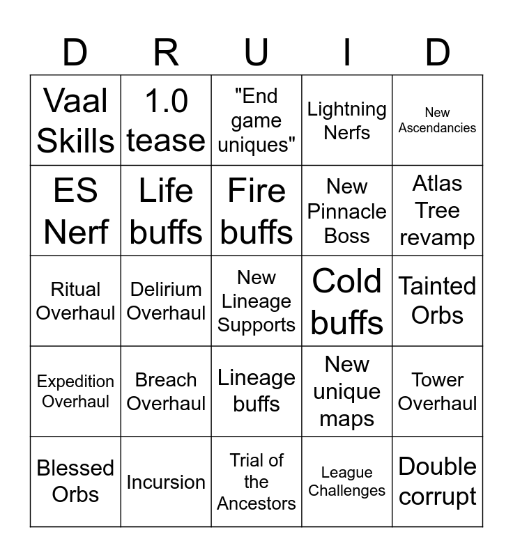 This bingo card has 28 words: Tower Overhaul, Div Cards, New Pinnacle Boss, League Challenges, ES Nerf, "End game uniques", 1.0 tease, Expedition Overhaul, Cold buffs, Blessed Orbs, Ritual Overhaul, Lightning Nerfs, Incursion, Trial of the Ancestors, Atlas Tree revamp, Thorns additions, Breach Overhaul, Life buffs, Fire buffs, Lineage buffs, Vaal Skills, Double corrupt, New Lineage Supports, Delirium Overhaul, Tainted Orbs, New unique maps, New Ascendancies and Skill weapon requirements opened up.