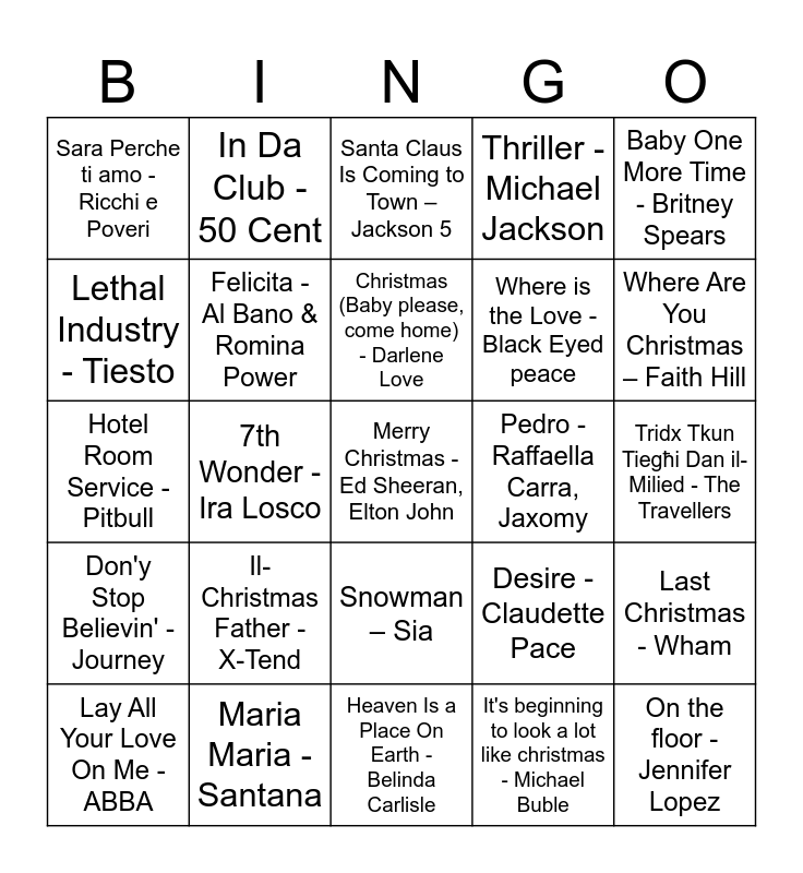 This bingo card has 42 words: Free!, Christmas (Baby please, come home) - Darlene Love, Feliz Navidad – José Feliciano, Il-Christmas Father - X-Tend, It's beginning to look a lot like christmas - Michael Buble, Last Christmas - Wham, Merry Christmas - Ed Sheeran, Elton John, Mistletoe - Justin Bieber, Santa Claus Is Coming to Town – Jackson 5, Snowman – Sia, Tridx Tkun Tiegħi Dan il-Milied - The Travellers, Where Are You Christmas – Faith Hill, 7th Wonder - Ira Losco, Baby One More Time - Britney Spears, Candy Shop - 50 Cent, Desire - Claudette Pace, Forever - Chris Brown, Hotel Room Service - Pitbull, I Want It That Way - Backstreet Boys, In Da Club - 50 Cent, Lethal Industry - Tiesto, Macarena - Los Del Rio, On the floor - Jennifer Lopez, Sara Perche ti amo - Ricchi e Poveri, Wake Me Up - Avicii, We don't care - Akon, Where is the Love - Black Eyed peace, Zombie - The Cranberries, Bella Ciao - Hugel, Brother Louie - Modern Talking, Could You Be Loved - Bob Marley & The Wailers, Don'y Stop Believin' - Journey, Felicita - Al Bano & Romina Power, Heaven Is a Place On Earth - Belinda Carlisle, I Want to Know What Love Is - Foreigner, Lay All Your Love On Me - ABBA, Maria Maria - Santana, Pedro - Raffaella Carra, Jaxomy, She Doesn't Mind - Sean Paul, Take On Me - A-Ha, Thriller - Michael Jackson and Uptown Girl - Billy Joel.