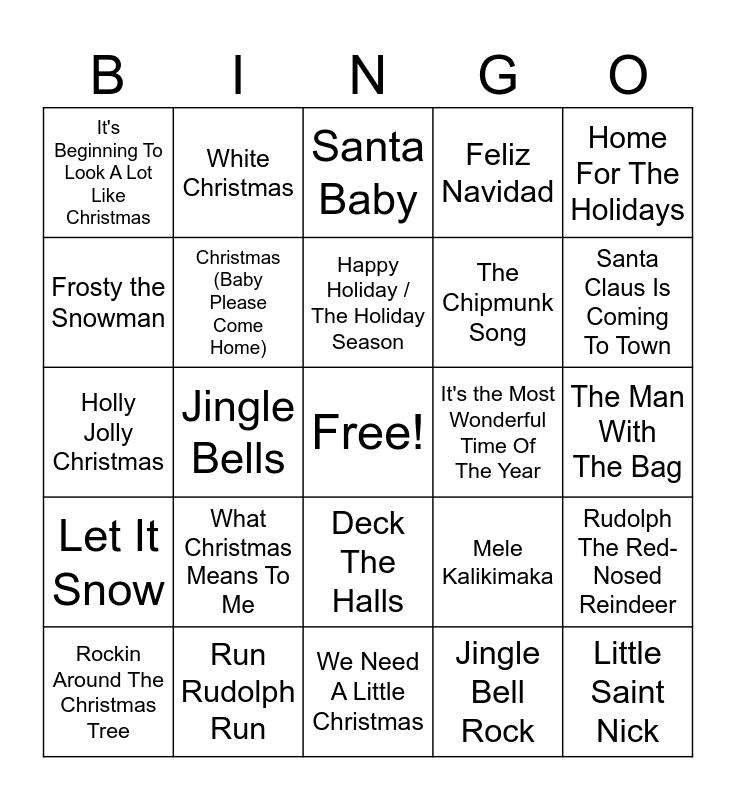 This bingo card has a free space and 35 words: A Marshmallow World, Baby, It's Cold Outside, Blue Christmas, Christmas (Baby Please Come Home), Deck The Halls, Feliz Navidad, Frosty the Snowman, Grandma Got Run Over by a Reindeer, Happy Holiday / The Holiday Season, Here Comes Santa Claus, Holly Jolly Christmas, Home For The Holidays, I Saw Mommy Kissing Santa Claus, I Want A Hippopotamus For Christmas, It's Beginning To Look A Lot Like Christmas, It's the Most Wonderful Time Of The Year, Jingle Bell Rock, Jingle Bells, Let It Snow, Little Saint Nick, Mele Kalikimaka, Rockin Around The Christmas Tree, Rudolph The Red-Nosed Reindeer, Run Rudolph Run, Santa Baby, Santa Claus Is Coming To Town, Silver Bells, Sleigh Ride, The Chipmunk Song, The Man With The Bag, The Merriest, We Need A Little Christmas, What Christmas Means To Me, White Christmas and Winter Wonderland.