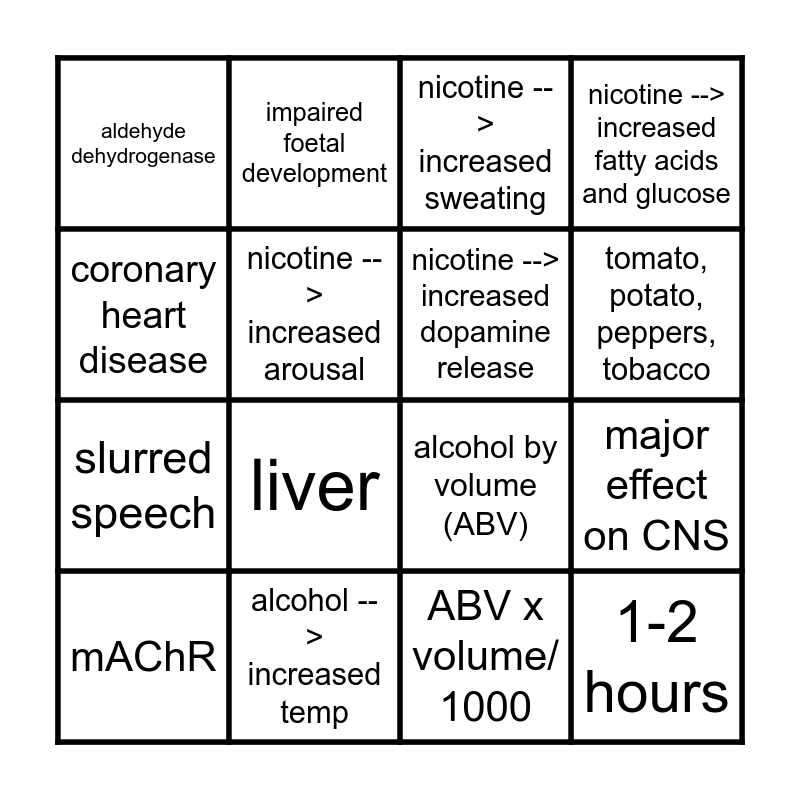 This bingo card has 30 words: cotinine, nicotine --> increased heart rate and blood pressure, major effect on CNS, small intestine, aldehyde dehydrogenase, nicotine --> increased sweating, nicotine --> increased dopamine release, COPD, alcohol --> increased temp, alcohol --> liver disease, ABV x volume/ 1000, mAChR, alcohol --> increased urination, alcohol dehydrogenase, liver, nAChR, nicotine turns brown, 1-2 hours, 'need' to smoke every 2 hours, coronary heart disease, alcohol by volume (ABV), fatty liver and reduced glycolysis, impaired foetal development, slurred speech, nicotine --> increased arousal, nicotine --> increased fatty acids and glucose, nicotine --> apoptosis, nicotine --> nicotine --> decreased appetite, tomato, potato, peppers, tobacco and noradrenaline.