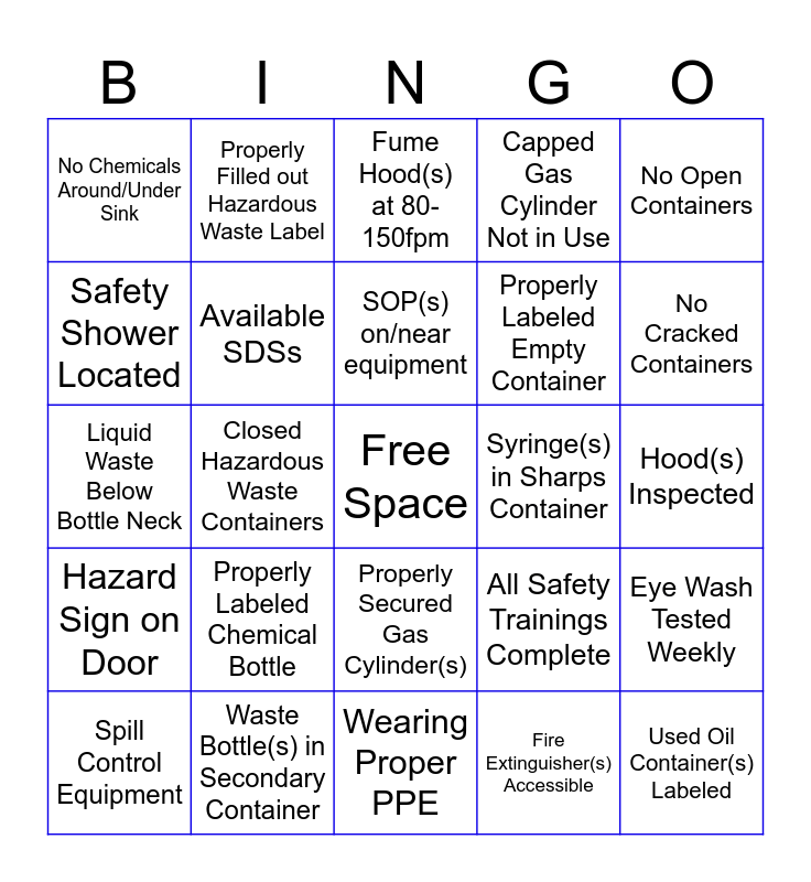 This bingo card has a free space and 24 words: Properly Labeled Chemical Bottle, Waste Bottle(s) in Secondary Container, SOP(s) on/near equipment, Spill Control Equipment, No Open Containers, No Chemicals Around/Under Sink, Safety Shower Located, Properly Filled out Hazardous Waste Label, Syringe(s) in Sharps Container, Properly Secured Gas Cylinder(s), Properly Labeled Empty Container, Liquid Waste Below Bottle Neck, All Safety Trainings Complete, Eye Wash Tested Weekly, Available SDSs, Fire Extinguisher(s) Accessible, Hood(s) Inspected, Fume Hood(s) at 80-150fpm, No Cracked Containers, Closed Hazardous Waste Containers, Used Oil Container(s) Labeled, Hazard Sign on Door, Capped Gas Cylinder Not in Use and Wearing Proper PPE.