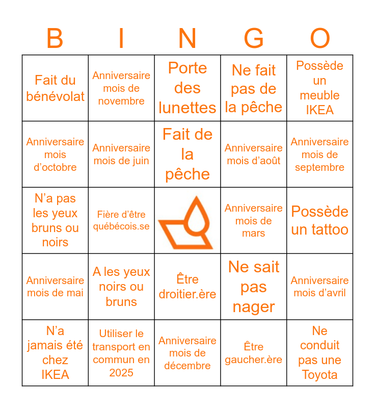 This bingo card has a free space and 38 words: Arrêter le café, Anniversaire mois de janvier, Anniversaire mois de février, Anniversaire mois de mars, Anniversaire mois d’avril, Anniversaire mois de mai, Anniversaire mois de juin, Anniversaire mois de juillet, Anniversaire mois d’août, Anniversaire mois de septembre, Anniversaire mois d’octobre, Anniversaire mois de novembre, Anniversaire mois de décembre, Ne sait pas nager, Possède un meuble IKEA, N’a pas les yeux bruns ou noirs, Fait un voyage seul, Porte des lunettes, Parler plus de 4 langues, Possède un tattoo, Fait du bénévolat, Utiliser le transport en commun en 2025, Fait de la pêche, Être gaucher.ère, Possède un animal de compagnon, Porte du rouge aujourd’hui, Porte du vert aujourd’hui, Avoir lu 5 livres en 2025, A une allergie, Boire 1,5L d’eau par jour, Jour un instrument de la musique, A les yeux noirs ou bruns, Être droitier.ère, Ne fait pas de la pêche, Ne conduit pas une Toyota, N’a jamais été chez IKEA, Fière d’être québécois.se and Apprécie mon directeur de production.