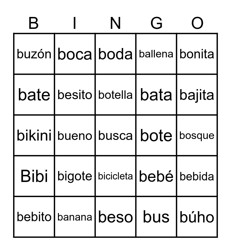 This bingo card has 27 words: bebé, búho, bata, beso, bate, boda, boca, Bibi, bote, bebida, bikini, ballena, bebito, banana, bajita, babero, besito, botella, bigote, buzón, bosque, bus, bueno, busca, bicicleta, bonita and baja.