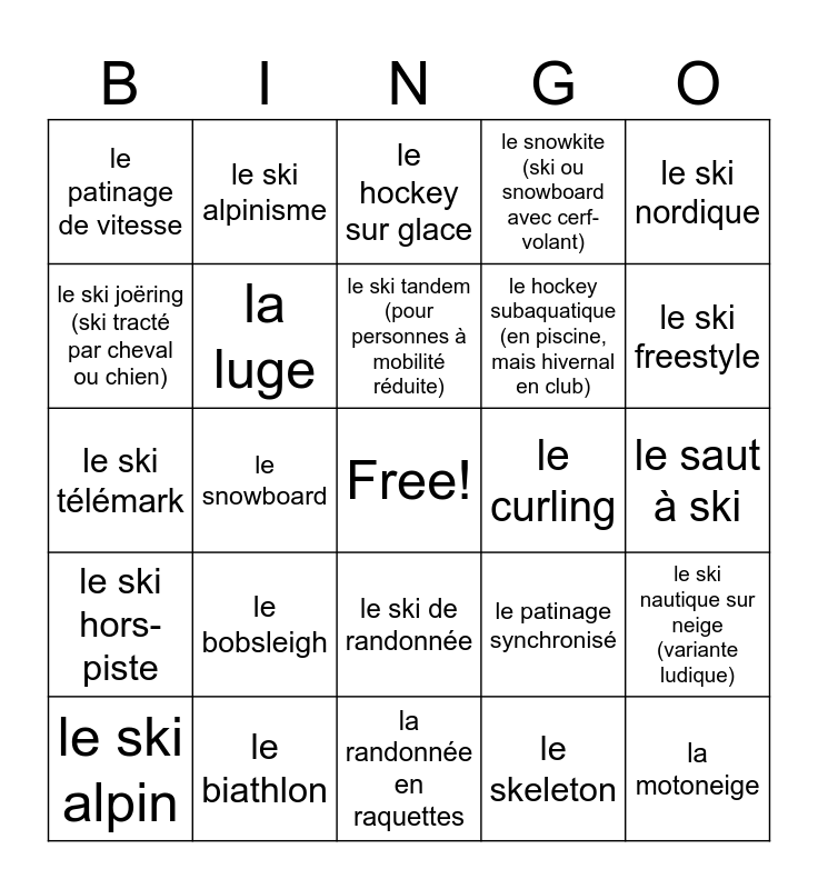 This bingo card has a free space and 29 words: le ski alpin, le ski de fond, le snowboard, le patinage artistique, le patinage de vitesse, le hockey sur glace, la luge, le bobsleigh, le curling, le biathlon, le saut à ski, la motoneige, la randonnée en raquettes, le skeleton, le ski freestyle, le ski acrobatique, le ski de randonnée, le ski hors-piste, le ski nordique, le ski télémark, le patinage synchronisé, le patinage extrême, le hockey subaquatique (en piscine, mais hivernal en club), le ski joëring (ski tracté par cheval ou chien), le snowkite (ski ou snowboard avec cerf-volant), le ski alpinisme, le ski nautique sur neige (variante ludique), le ski tandem (pour personnes à mobilité réduite) and le ski parabole (style spécifique de ski).