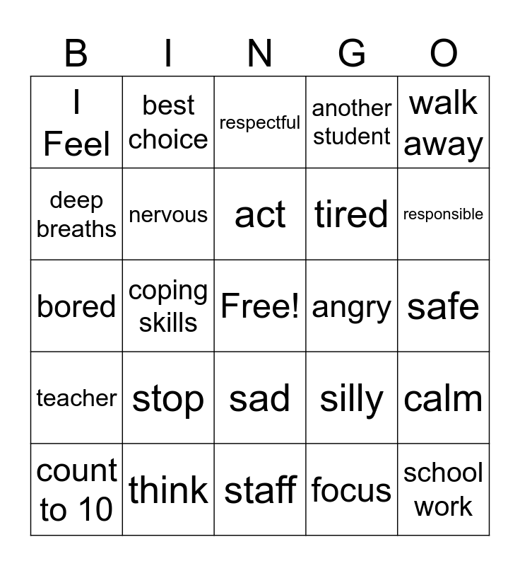 This bingo card has a free space and 24 words: stop, think, act, count to 10, walk away, I Feel, deep breaths, best choice, angry, sad, tired, bored, silly, calm, nervous, focus, safe, respectful, responsible, coping skills, school work, teacher, another student and staff.
