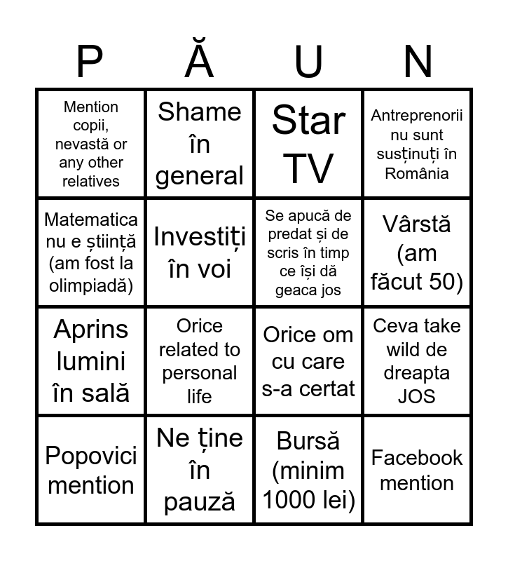 This bingo card has 16 words: Popovici mention, Ne ține în pauză, Star TV, Antreprenorii nu sunt susținuți în România, Matematica nu e știință (am fost la olimpiadă), Shame în general, Orice om cu care s-a certat, Ceva take wild de dreapta JOS, Mention copii, nevastă or any other relatives, Investiți în voi, Bursă (minim 1000 lei), Vârstă (am făcut 50), Aprins lumini în sală, Orice related to personal life, Se apucă de predat și de scris în timp ce își dă geaca jos and Facebook mention.