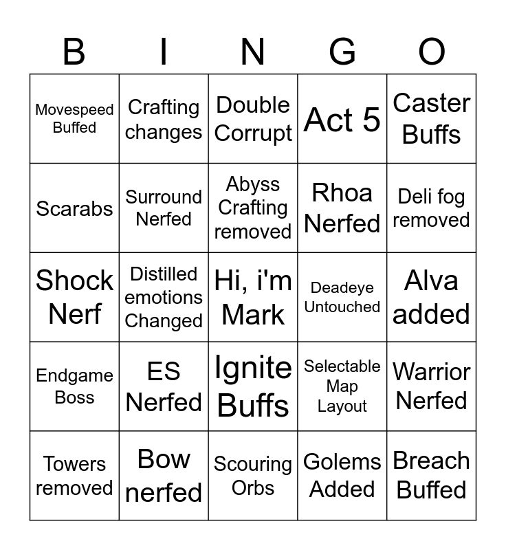 This bingo card has a free space and 24 words: ES Nerfed, Bow nerfed, Abyss Crafting removed, Towers removed, Caster Buffs, Movespeed Buffed, Scarabs, Crafting changes, Deadeye Untouched, Ignite Buffs, Rhoa Nerfed, Shock Nerf, Selectable Map Layout, Warrior Nerfed, Surround Nerfed, Golems Added, Alva added, Double Corrupt, Deli fog removed, Distilled emotions Changed, Breach Buffed, Endgame Boss, Act 5 and Scouring Orbs.