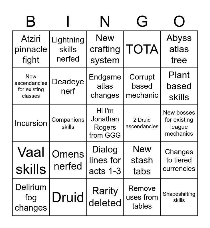 This bingo card has a free space and 24 words: Omens nerfed, Druid, Endgame atlas changes, Delirium fog changes, Abyss atlas tree, Atziri pinnacle fight, New ascendancies for existing classes, Lightning skills nerfed, 2 Druid ascendancies, Dialog lines for acts 1-3, Corrupt based mechanic, Incursion, New stash tabs, Changes to tiered currencies, Deadeye nerf, Remove uses from tables, New bosses for existing league mechanics, New crafting system, Plant based skills, Companions skills, Shapeshifting skills, Vaal skills, TOTA and Rarity deleted.