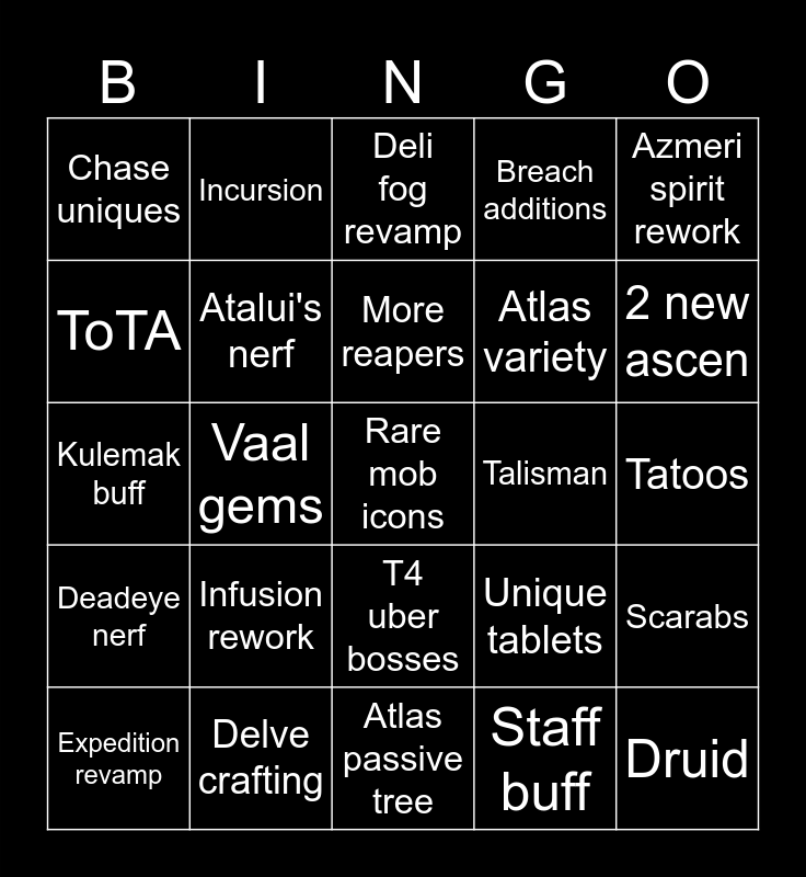 This bingo card has a free space and 24 words: Infusion rework, Delve crafting, More reapers, Expedition revamp, Azmeri spirit rework, Chase uniques, ToTA, Incursion, Talisman, T4 uber bosses, Atlas variety, Kulemak buff, Unique tablets, Scarabs, Atalui's nerf, Staff buff, Tatoos, Deli fog revamp, 2 new ascen, Vaal gems, Druid, Deadeye nerf, Breach additions and Atlas passive tree.