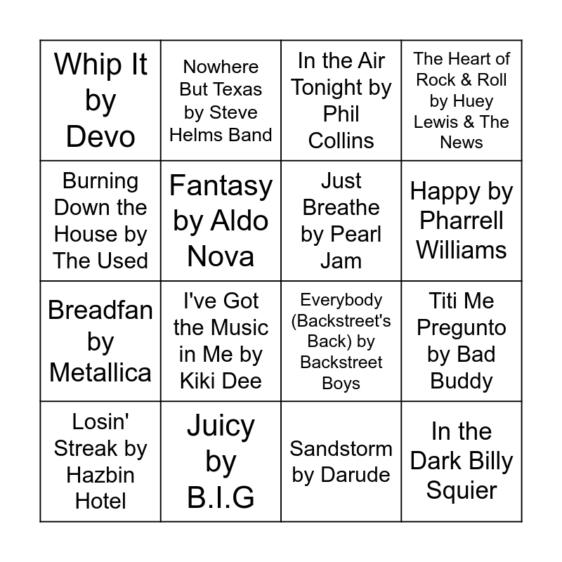 This bingo card has 17 words: Sandstorm by Darude, Losin' Streak by Hazbin Hotel, In the Air Tonight by Phil Collins, Whip It by Devo, I've Got the Music in Me by Kiki Dee, The Heart of Rock & Roll by Huey Lewis & The News, Titi Me Pregunto by Bad Buddy, Just Breathe by Pearl Jam, Happy by Pharrell Williams, Fantasy by Aldo Nova, Juicy by B.I.G, Everybody (Backstreet's Back) by Backstreet Boys, Burning Down the House by The Used, Nowhere But Texas by Steve Helms Band, Breadfan by Metallica, Elastic Heart by Sia and In the Dark Billy Squier.
