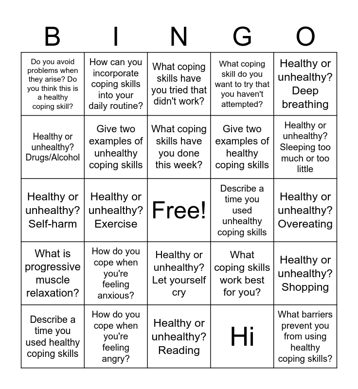This bingo card has a free space and 25 words: How do you cope when you're feeling anxious?, Healthy or unhealthy? Reading, What coping skills have you done this week?, Describe a time you used healthy coping skills, Healthy or unhealthy? Deep breathing, Do you avoid problems when they arise? Do you think this is a healthy coping skill?, Healthy or unhealthy? Drugs/Alcohol, How can you incorporate coping skills into your daily routine?, Describe a time you used unhealthy coping skills, Healthy or unhealthy? Let yourself cry, Give two examples of healthy coping skills, Healthy or unhealthy? Self-harm, What coping skills work best for you?, Healthy or unhealthy? Shopping, Give two examples of unhealthy coping skills, How do you cope when you're feeling depressed?, Healthy or unhealthy? Overeating, What coping skills have you tried that didn't work?, Healthy or unhealthy? Sleeping too much or too little, Healthy or unhealthy? Exercise, What barriers prevent you from using healthy coping skills?, How do you cope when you're feeling angry?, What is progressive muscle relaxation?, What coping skill do you want to try that you haven't attempted? and Hi.