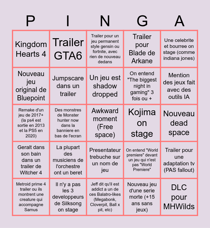 This bingo card has a free space and 24 words: La plupart des musiciens de l'orchestre ont un beret, Il n'y a pas les 3 developpeurs de Silksong on stage, Un jeu est shadow dropped, Metroid prime 4 trailer ou ils montrent une creature qui accompagne Samus, Une celebrite et bourree on stage (comme indiana jones), Kingdom Hearts 4, Nouveau jeu original de Bluepoint, Trailer GTA6, Kojima on stage, Presentateur trebuche sur un nom de jeu, On entend "The biggest night in gaming" 3 fois ou +, Remake d'un jeu de 2017+ (la ps4 est sortie en 2013 et la PS5 en 2020), On entend "World premiere" devant un jeu qui n'est pas "World Premiere", Trailer pour une adaptation tv (PAS fallout), Jumpscare dans un trailer, Nouveau jeu d'une serie morte (+15 ans sans jeux), Nouveau dead space, Trailer pour un jeu permanent style gensin ou fortnite, avec rien de nouveau dedans, Mention des jeux fait avec des outils IA, Des monstres de Monster hunter now dans la banniere en bas de l'ecran, DLC pour MHWilds, Geralt dans son bain dans un trailer de Witcher 4, Trailer pour Blade de Arkane and Jeff dit qu'il est addict a un de ces Balatro-likes (Megabonk, Cloverpit, Ball x pit, etc).
