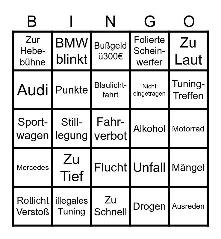 This bingo card has a free space and 24 words: Zu Tief, illegales Tuning, Blaulicht-fahrt, Rotlicht Verstoß, Zu Laut, Zur Hebe-bühne, Audi, BMW blinkt, Alkohol, Flucht, Nicht eingetragen, Sport-wagen, Unfall, Mängel, Punkte, Drogen, Motorrad, Bußgeld ü300€, Tuning-Treffen, Still-legung, Ausreden, Mercedes, Folierte Schein-werfer and Zu Schnell.