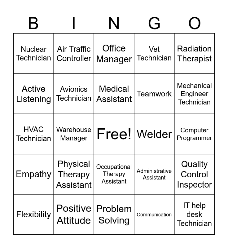 This bingo card has a free space and 34 words: Registered Nurse (RN), Communication, Dental Hygienist, Web Developer, Empathy, Avionics Technician, Radiation Therapist, Flexibility, Air Traffic Controller, Paralegal, Medical Assistant, Office Manager, Funeral Director, Dependable, Welder, Mechanical Engineer Technician, Positive Attitude, HVAC Technician, Physical Therapy Assistant, Administrative Assistant, Occupational Therapy Assistant, MRI Technician, Nuclear Technician, Computer Programmer, Problem Solving, IT help desk Technician, Vet Technician, Respiratory Therapist, Teamwork, Active Listening, Engineering Technician, Warehouse Manager, Quality Control Inspector and Time Management.