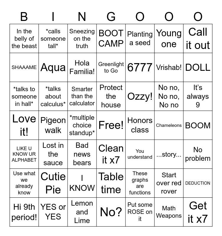This bingo card has a free space and 49 words: Start over red rover, Vrishab!, Put some ROSE on it, Pigeon walk, Smarter than the calculator, BOOM, *calls someone tall*, Lemon and Lime, Young one, Clean it x7, Call it out, BOOT CAMP, No no, No no, No no, Ozzy!, Cutie Pie, Chameleons, SHAAAME, DOLL, DEDUCTION, Planting a seed, 6777, *multiple choice standup*, In the belly of the beast, Aqua, Hi 9th period!, Hola Familia!, It’s always 9, YES or YES, Protect the house, *talks about calculus*, So excited!!, Honors class, Use what we already know, I KNOW, Love it!, You understand, ...story..., No problem, *talks to someone in hall*, Bad news bears, Table time, LIKE U KNOW UR ALPHABET, Get it x7, No?, Greenlight to Go, Sneezing on the truth, These graphs are functions, Lost in the sauce and Math Weapons.