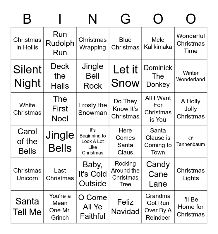 This bingo card has 1 images and 45 words: White Christmas, Merry Little Christmas, Santa Clause is Coming to Town, All I Want For Christmas is You, Rocking Around the Christmas Tree, Run Rudolph Run, Merry Christmas Darling, Wonderful Christmas Time, You're a Mean One Mr. Grinch, Silent Night, Blue Christmas, Jingle Bells, Carol of the Bells, Grandma Got Run Over By A Reindeer, Baby, It's Cold Outside, Deck the Halls, The First Noel, The Twelve Days of Christmas, Mele Kalikimaka, Winter Wonderland, O' Tannenbaum, Christmas in Hollis, Jingle Bell Rock, Rudolph the Red-Nosed Reindeer, Let it Snow, It's Beginning to Look A Lot Like Christmas, Sleigh Ride, A Holly Jolly Christmas, Do They Know It's Christmas, Santa Baby, Last Christmas, Feliz Navidad, I'll Be Home for Christmas, O Come All Ye Faithful, Here Comes Santa Claus, Frosty the Snowman, Santa Tell Me, I Saw Mommy Kissing Santa Claus, Candy Cane Lane, Christmas Unicorn, Christmas Wrapping, Dominick The Donkey, I'm am Elf, Christmas Lights and Ho Ho Hold Me Close.