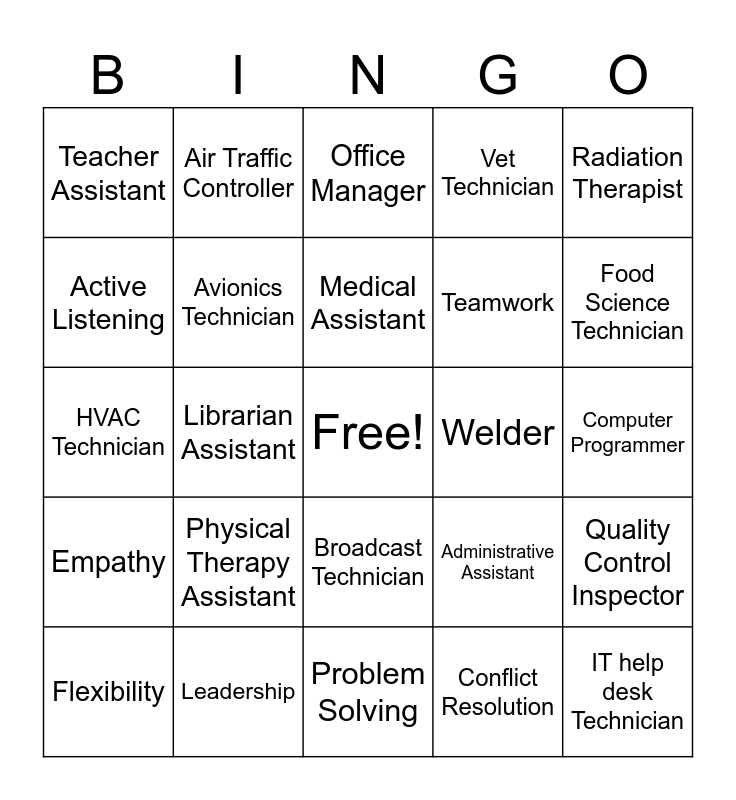 This bingo card has a free space and 34 words: Ranch Manager, Conflict Resolution, Dental Hygienist, Web Developer, Empathy, Avionics Technician, Radiation Therapist, Flexibility, Air Traffic Controller, Paralegal, Medical Assistant, Office Manager, Radiology Technician, Critical Thinking, Welder, Food Science Technician, Leadership, HVAC Technician, Physical Therapy Assistant, Administrative Assistant, Broadcast Technician, MRI Technician, Teacher Assistant, Computer Programmer, Problem Solving, IT help desk Technician, Vet Technician, Professionalism, Teamwork, Active Listening, Pre School Teacher, Librarian Assistant, Quality Control Inspector and Time Management.