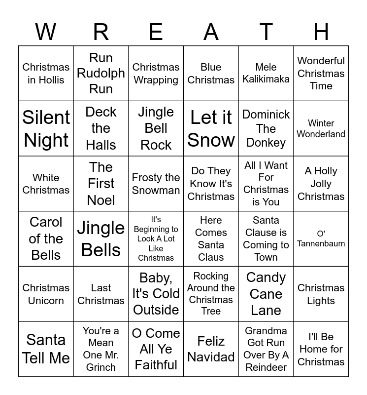 This bingo card has 1 images and 45 words: White Christmas, Merry Little Christmas, Santa Clause is Coming to Town, All I Want For Christmas is You, Rocking Around the Christmas Tree, Run Rudolph Run, Merry Christmas Darling, Wonderful Christmas Time, You're a Mean One Mr. Grinch, Silent Night, Blue Christmas, Jingle Bells, Carol of the Bells, Grandma Got Run Over By A Reindeer, Baby, It's Cold Outside, Deck the Halls, The First Noel, The Twelve Days of Christmas, Mele Kalikimaka, Winter Wonderland, O' Tannenbaum, Christmas in Hollis, Jingle Bell Rock, Rudolph the Red-Nosed Reindeer, Let it Snow, It's Beginning to Look A Lot Like Christmas, Sleigh Ride, A Holly Jolly Christmas, Do They Know It's Christmas, Santa Baby, Last Christmas, Feliz Navidad, I'll Be Home for Christmas, O Come All Ye Faithful, Here Comes Santa Claus, Frosty the Snowman, Santa Tell Me, I Saw Mommy Kissing Santa Claus, Candy Cane Lane, Christmas Unicorn, Christmas Wrapping, Dominick The Donkey, I'm am Elf, Christmas Lights and Ho Ho Hold Me Close.