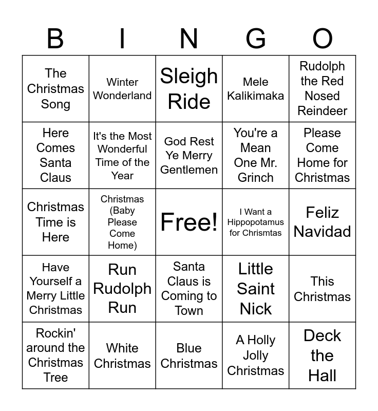 This bingo card has a free space and 29 words: Rockin' around the Christmas Tree, Let it Snow! Let it Snow! Let it Snow!, Christmas (Baby Please Come Home), Jingle Bell Rock, The Christmas Song, Sleigh Ride, It's the Most Wonderful Time of the Year, Run Rudolph Run, I Want a Hippopotamus for Chrismtas, White Christmas, Feliz Navidad, Deck the Hall, Blue Christmas, A Holly Jolly Christmas, Please Come Home for Christmas, It's Beginning to Look a Lot Like Christmas, Santa Claus is Coming to Town, Have Yourself a Merry Little Christmas, Rudolph the Red Nosed Reindeer, Christmas Time is Here, Little Saint Nick, Jingle Bells, You're a Mean One Mr. Grinch, Here Comes Santa Claus, Mele Kalikimaka, Winter Wonderland, This Christmas, God Rest Ye Merry Gentlemen and Linus and Lucy.