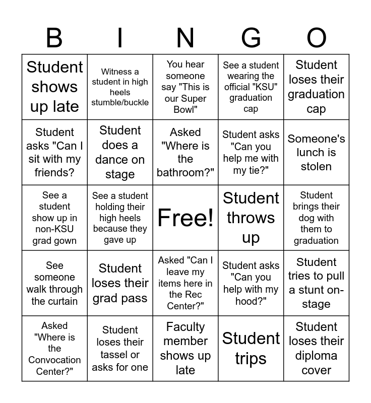 This bingo card has a free space and 24 words: Student loses their grad pass, Student loses their tassel or asks for one, Asked "Where is the bathroom?", Asked "Where is the Convocation Center?", Student loses their graduation cap, Student shows up late, Student asks "Can I sit with my friends?, Witness a student in high heels stumble/buckle, Student throws up, Asked "Can I leave my items here in the Rec Center?", Student asks "Can you help me with my tie?", See a student show up in non-KSU grad gown, Student asks "Can you help with my hood?", Student tries to pull a stunt on-stage, Student does a dance on stage, Student trips, Student brings their dog with them to graduation, You hear someone say "This is our Super Bowl", Someone's lunch is stolen, See a student holding their high heels because they gave up, Student loses their diploma cover, See someone walk through the curtain, See a student wearing the official "KSU" graduation cap and Faculty member shows up late.