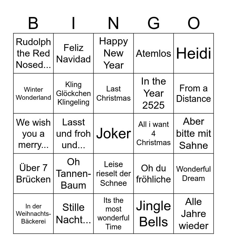 This bingo card has a free space and 24 words: Oh Tannen-Baum, Stille Nacht..., Last Christmas, In der Weihnachts-Bäckerei, Heidi, Rudolph the Red Nosed..., Winter Wonderland, Feliz Navidad, All i want 4 Christmas, Leise rieselt der Schnee, In the Year 2525, We wish you a merry..., Oh du fröhliche, Wonderful Dream, Kling Glöckchen Klingeling, Jingle Bells, Aber bitte mit Sahne, Happy New Year, From a Distance, Lasst und froh und..., Alle Jahre wieder, Über 7 Brücken, Atemlos and Its the most wonderful Time.