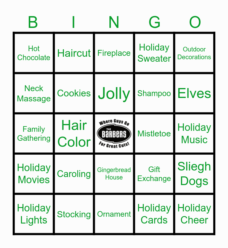 This bingo card has a free space and 34 words: Shears, Holiday Cards, North Pole, Holiday Socks, Holiday Movies, Cookies, Outdoor Decorations, Holiday Lights, Haircut, Candy Canes, Jolly, Fireplace, Neck Shave, Presents, Mistletoe, Elves, Stocking, Family Gathering, Caroling, Gift Exchange, Gingerbread House, Festive Pajamas, Hot Chocolate, Holiday Music, Ornament, Holiday Cheer, Holiday Sweater, Snow, Shampoo, Neck Massage, Trees, Hair Color, Sliegh Dogs and Mittens.