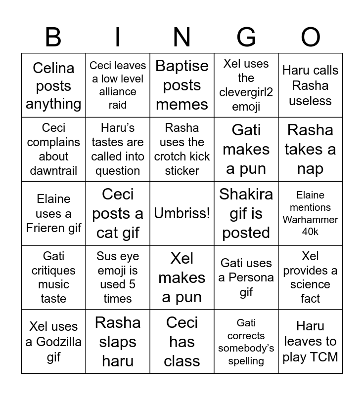 This bingo card has a free space and 24 words: Sus eye emoji is used 5 times, Rasha slaps haru, Rasha uses the crotch kick sticker, Xel uses a Godzilla gif, Haru calls Rasha useless, Celina posts anything, Ceci complains about dawntrail, Ceci leaves a low level alliance raid, Shakira gif is posted, Xel makes a pun, Gati makes a pun, Elaine uses a Frieren gif, Gati uses a Persona gif, Xel provides a science fact, Haru’s tastes are called into question, Gati corrects somebody’s spelling, Elaine mentions Warhammer 40k, Baptise posts memes, Rasha takes a nap, Ceci posts a cat gif, Haru leaves to play TCM, Gati critiques music taste, Xel uses the clevergirl2 emoji and Ceci has class.