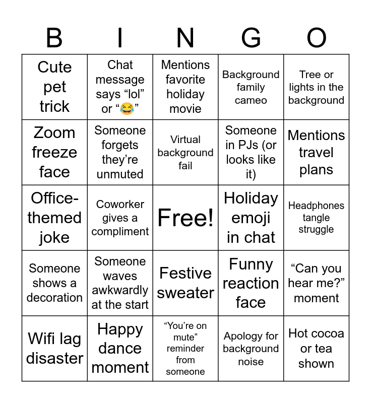 This bingo card has a free space and 35 words: Pet cameo on camera, Holiday mug sighting, Accidental mute moment, Someone forgets they’re unmuted, Festive sweater, Background family cameo, Zoom freeze face, Cozy blanket visible, Virtual background fail, Someone laughs really hard, Office-themed joke, Tree or lights in the background, Someone eating on camera, Doorbell rings, Cute pet trick, Holiday emoji in chat, Apology for background noise, Coworker gives a compliment, Someone shows a decoration, Hot cocoa or tea shown, Funny reaction face, Wifi lag disaster, “Can you hear me?” moment, Happy dance moment, Mentions favorite holiday movie, Mentions travel plans, Someone joins late, Talks about New Year’s goals, Someone in PJs (or looks like it), Headphones tangle struggle, Someone’s kid pops into frame, “You’re on mute” reminder from someone, Someone waves awkwardly at the start, Chat message says “lol” or “😂” and Someone’s camera turns off mid-call.
