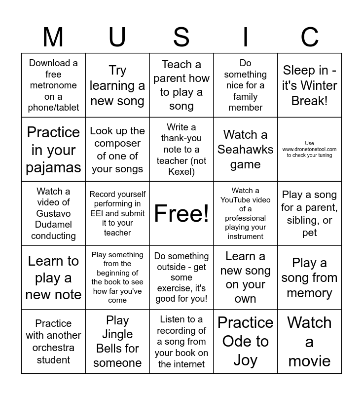 This bingo card has a free space and 24 words: Play something from the beginning of the book to see how far you've come, Play Jingle Bells for someone, Write a thank-you note to a teacher (not Kexel), Practice with another orchestra student, Sleep in - it's Winter Break!, Download a free metronome on a phone/tablet, Practice in your pajamas, Try learning a new song, Watch a YouTube video of a professional playing your instrument, Do something outside - get some exercise, it's good for you!, Watch a Seahawks game, Watch a video of Gustavo Dudamel conducting, Learn a new song on your own, Play a song from memory, Look up the composer of one of your songs, Practice Ode to Joy, Play a song for a parent, sibling, or pet, Teach a parent how to play a song, Use www.dronetonetool.com to check your tuning, Record yourself performing in EEI and submit it to your teacher, Watch a movie, Learn to play a new note, Do something nice for a family member and Listen to a recording of a song from your book on the internet.