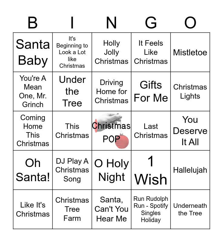 This bingo card has a free space and 44 words: Santa Tell Me, Underneath the Tree, santa doesn't know you like i do, Like It's Christmas, Snowman, Run Rudolph Run - Spotify Singles Holiday, Holly Jolly Christmas, You Make It Feel Like Christmas, Mistletoe, Christmas Tree Farm, It Feels Like Christmas, Last Christmas, O Holy Night, DJ Play A Christmas Song, Rockin' Around The Christmas Tree, Santa, Can't You Hear Me, A Nonsense Christmas, Coming Home This Christmas, My Only Wish, Christmas Lights, It's Beginning to Look a Lot like Christmas, Blue Christmas, Merry Christmas, Santa Baby, The Christmas Song, You Deserve It All, Christmas, River, 1 Wish, Oh Santa!, promise to me, Hallelujah, Have Yourself a Merry Little Christmas, old fashioned christmas, This Christmas, canal street, Officially Christmas, Not Just On Christmas, Driving Home for Christmas, You're A Mean One, Mr. Grinch, Gifts For Me, Love to Keep Me Warm, Under the Tree and I Wanna Be Your Christmas Tree.