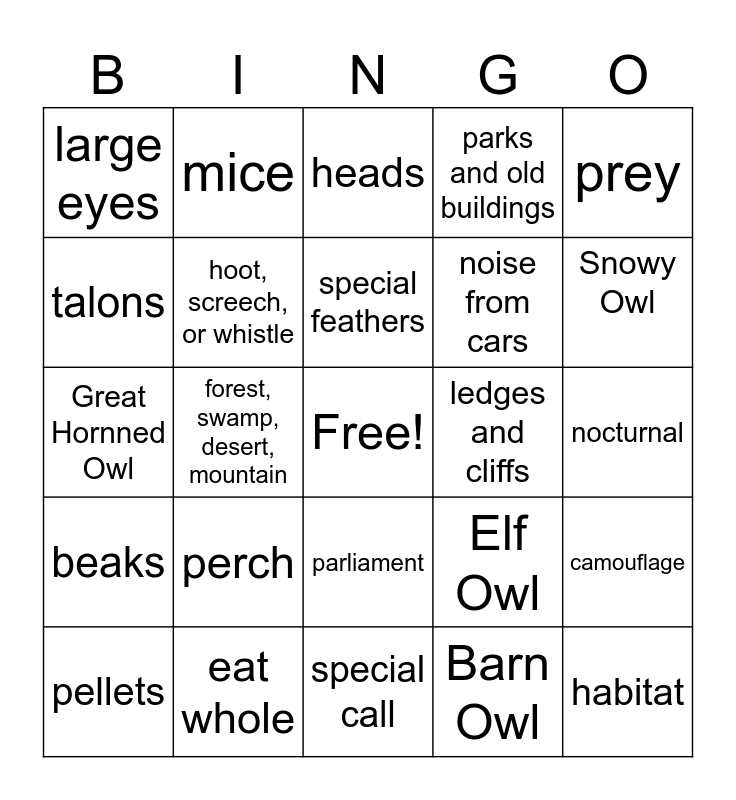 This bingo card has a free space and 24 words: perch, eat whole, special feathers, pellets, prey, large eyes, talons, mice, ledges and cliffs, parliament, noise from cars, Great Hornned Owl, Elf Owl, camouflage, hoot, screech, or whistle, Barn Owl, nocturnal, heads, Snowy Owl, forest, swamp, desert, mountain, habitat, beaks, parks and old buildings and special call.