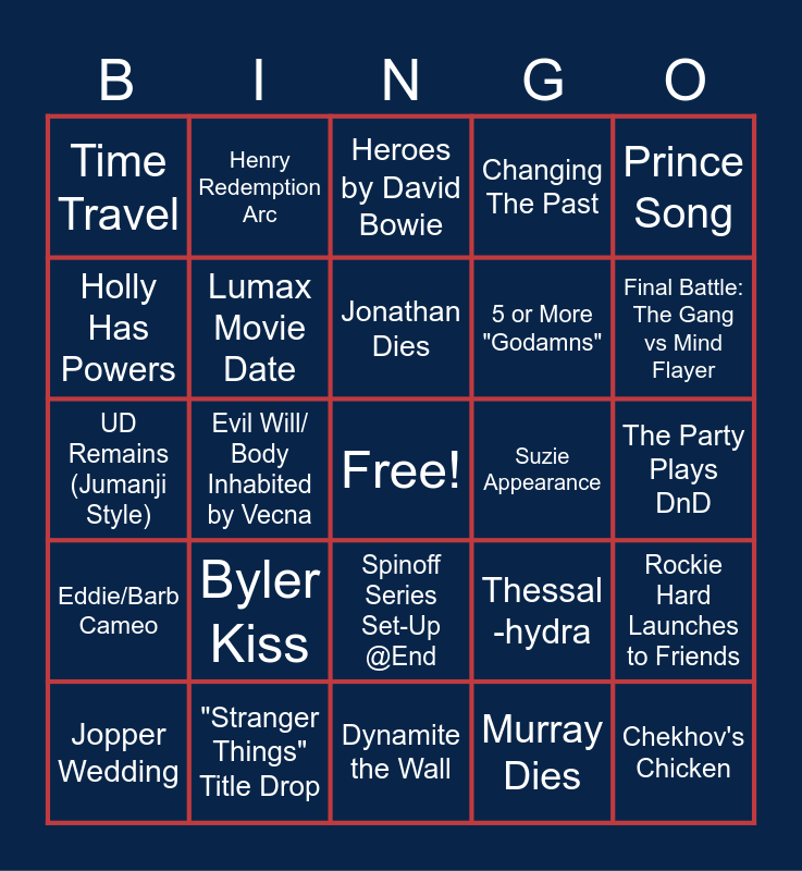 This bingo card has a free space and 24 words: Byler Kiss, "Stranger Things" Title Drop, Jonathan Dies, Jopper Wedding, Prince Song, Time Travel, Holly Has Powers, Henry Redemption Arc, Suzie Appearance, Spinoff Series Set-Up @End, 5 or More "Godamns", UD Remains (Jumanji Style), Thessal -hydra, Rockie Hard Launches to Friends, Lumax Movie Date, Murray Dies, The Party Plays DnD, Heroes by David Bowie, Final Battle: The Gang vs Mind Flayer, Evil Will/ Body Inhabited by Vecna, Chekhov's Chicken, Eddie/Barb Cameo, Changing The Past and Dynamite the Wall.
