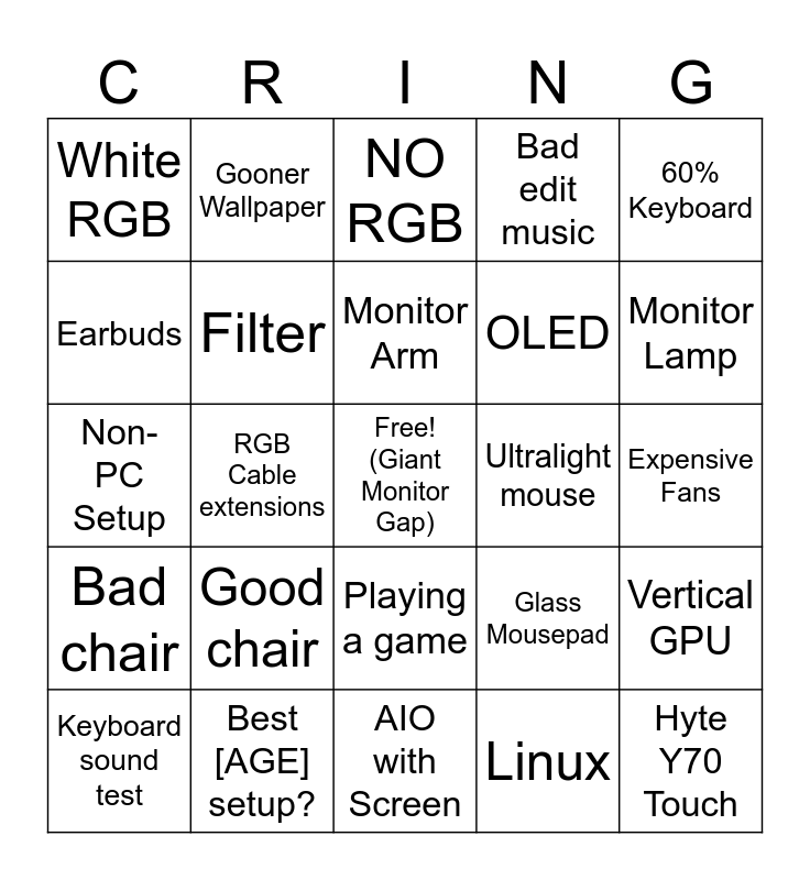 This bingo card has a free space and 31 words: AIO with Screen, Monitor on computer, RGB Cable extensions, Random Screen, White RGB, NO RGB, Filter, Glass Mousepad, Ultralight mouse, Linux, Expensive Fans, Hyte Y70 Touch, "Girls", Background Lights, Monitor Lamp, Streamdeck, Vertical GPU, Good chair, Bad chair, Playing a game, 60% Keyboard, Monitor scoliosis, Keyboard sound test, Gooner Wallpaper, OLED, Earbuds, Bad edit music, Non-PC Setup, Best [AGE] setup?, Monitor Arm and Product Placement.