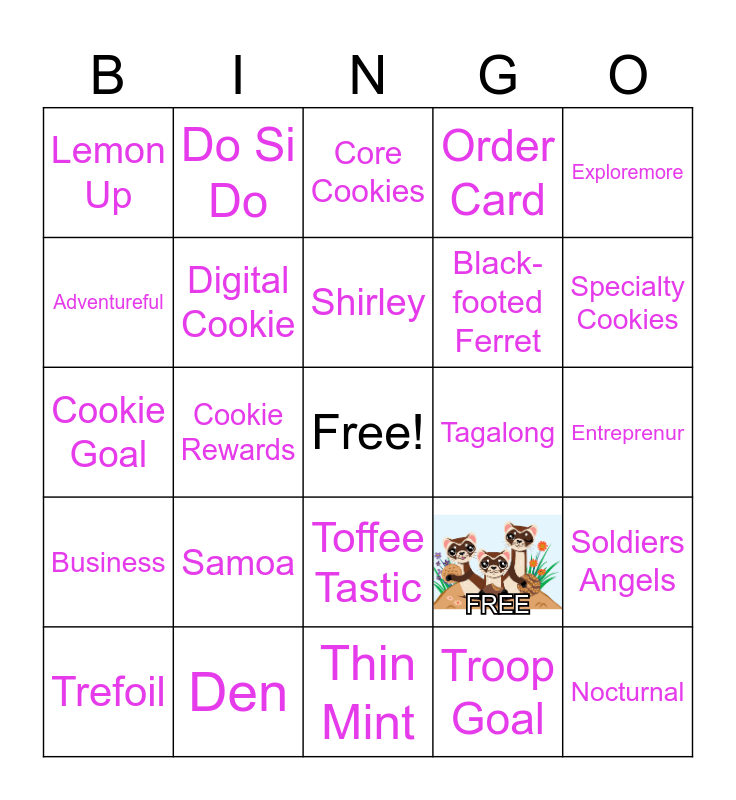 This bingo card has 1 images, a free space and 25 words: Samoa, Thin Mint, Shirley, Trefoil, Exploremore, Lemon Up, Adventureful, Do Si Do, Tagalong, Toffee Tastic, Black-footed Ferret, Cookie Goal, FREE, Soldiers Angels, Digital Cookie, Brave. Fierce. Fun!, Entreprenur, Core Cookies, Specialty Cookies, Cookie Rewards, Nocturnal, Den, Business, Order Card and Troop Goal.