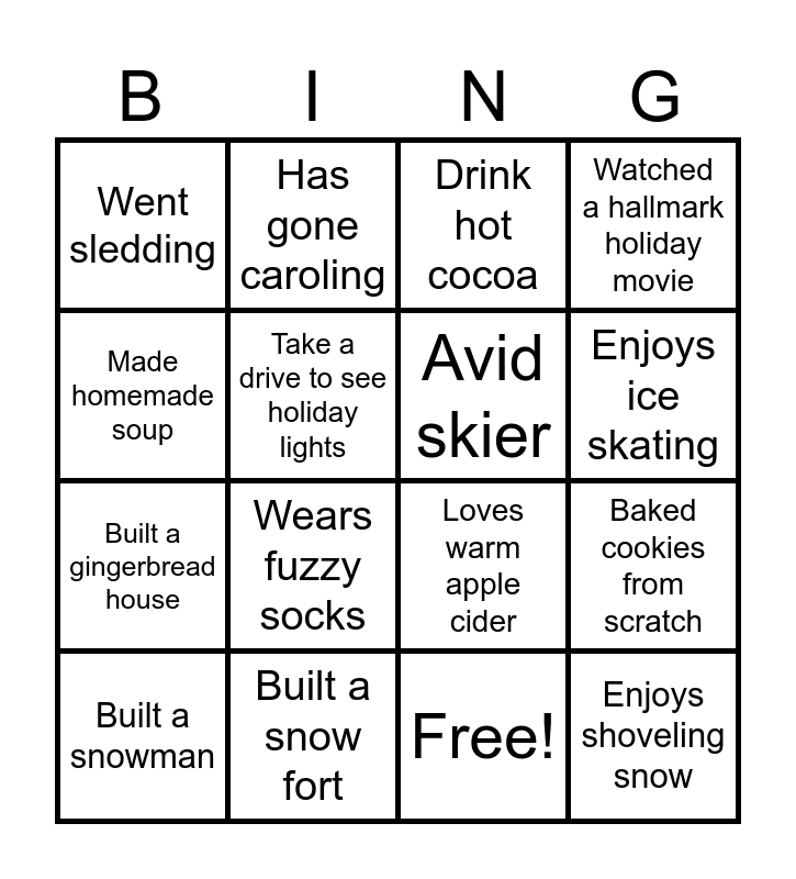 This bingo card has 17 words: Free!, Built a snowman, Drink hot cocoa, Went sledding, Wears fuzzy socks, Watched a hallmark holiday movie, Baked cookies from scratch, Avid skier, Enjoys ice skating, Take a drive to see holiday lights, Built a snow fort, Loves warm apple cider, Made homemade soup, Has gone caroling, Built a gingerbread house, Owns an ugly Christmas sweater and Enjoys shoveling snow.