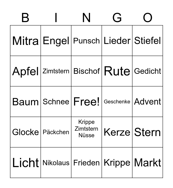 This bingo card has a free space and 26 words: Krippe Zimtstern Nüsse, Krippe, Bischof, Nikolaus, Stiefel, Mitra, Apfel, Engel, Advent, Kerze, Rute, Baum, Stern, Licht, Schnee, Plätzchen, Lieder, Glocke, Punsch, Markt, Gedicht, Frieden, Geschenke, Päckchen, Zimtstern and Nüsse.
