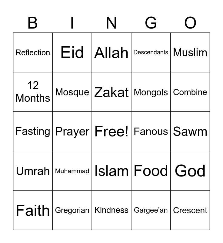 This bingo card has a free space and 32 words: Gargee’an, Iftar, Prayer, Tarawih, Umrah, Mosque, Muslim, God, Eid, Qur’an, Zakat, Allah, Water, Dates, Fanous, Suhoor, Faith, Fasting, Islam, Muhammad, Food, Ramadan, Sawm, Gregorian, Crescent, Descendants, Mongols, 12 Months, Reflection, Kindness, Markets and Combine.