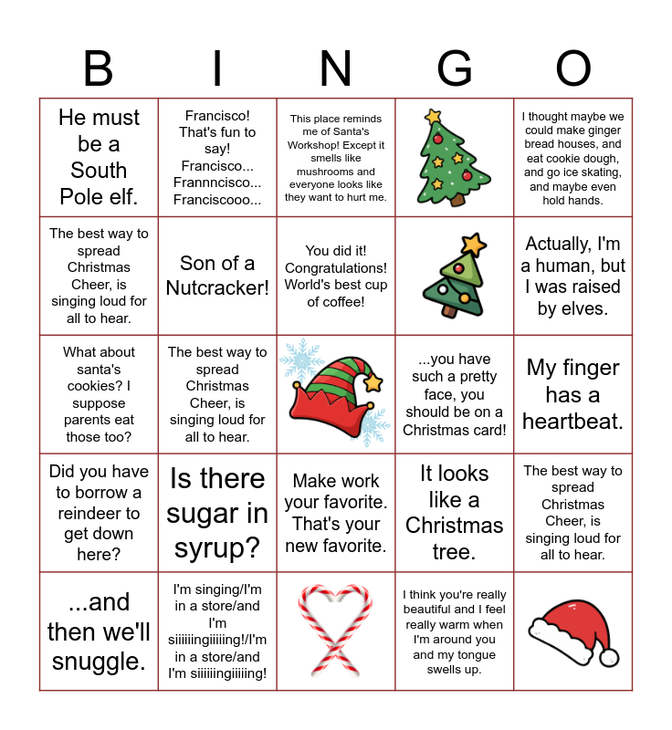 This bingo card has 5 images, a free space and 29 words: The best way to spread Christmas Cheer, is singing loud for all to hear., I think you're really beautiful and I feel really warm when I'm around you and my tongue swells up., SANTA! SANTA'S COMING! I KNOW HIM! I KNOW HIM!, Well, if you're Santa, what song did I sing for you on your birthday this year?, Did you have to borrow a reindeer to get down here?, Son of a Nutcracker!, I thought maybe we could make ginger bread houses, and eat cookie dough, and go ice skating, and maybe even hold hands., ...and then we'll snuggle., Francisco! That's fun to say! Francisco... Frannncisco... Franciscooo..., Did you hear that? You're weird., You did it! Congratulations! World's best cup of coffee!, This place reminds me of Santa's Workshop! Except it smells like mushrooms and everyone looks like they want to hurt me., You stink. You smell like beef and cheese! You don't smell like Santa., Of course you're not an elf. You're six-foot-three and had a beard since you were fifteen., ...you have such a pretty face, you should be on a Christmas card!, Actually, I'm a human, but I was raised by elves., I'm singing/I'm in a store/and I'm siiiiiingiiiiing!/I'm in a store/and I'm siiiiiingiiiiing!, What about santa's cookies? I suppose parents eat those too?, Is there sugar in syrup?, It looks like a Christmas tree., Make work your favorite. That's your new favorite., What do you want? Some money?, He must be a South Pole elf., My finger has a heartbeat., The best way to spread Christmas Cheer, is singing loud for all to hear., The best way to spread Christmas Cheer, is singing loud for all to hear., The best way to spread Christmas Cheer, is singing loud for all to hear., The best way to spread Christmas Cheer, is singing loud for all to hear. and The best way to spread Christmas Cheer, is singing loud for all to hear..