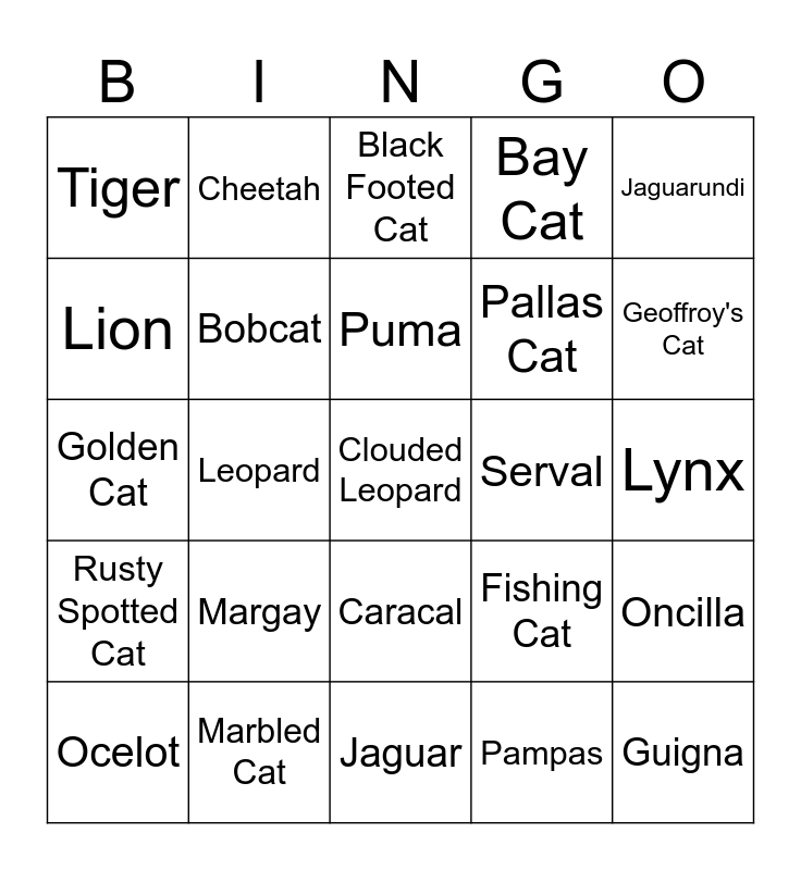 This bingo card has 25 words: Margay, Jaguar, Puma, Ocelot, Jaguarundi, Tiger, Lion, Cheetah, Serval, Caracal, Pallas Cat, Golden Cat, Fishing Cat, Oncilla, Bobcat, Guigna, Lynx, Black Footed Cat, Geoffroy's Cat, Leopard, Clouded Leopard, Marbled Cat, Rusty Spotted Cat, Bay Cat and Pampas.