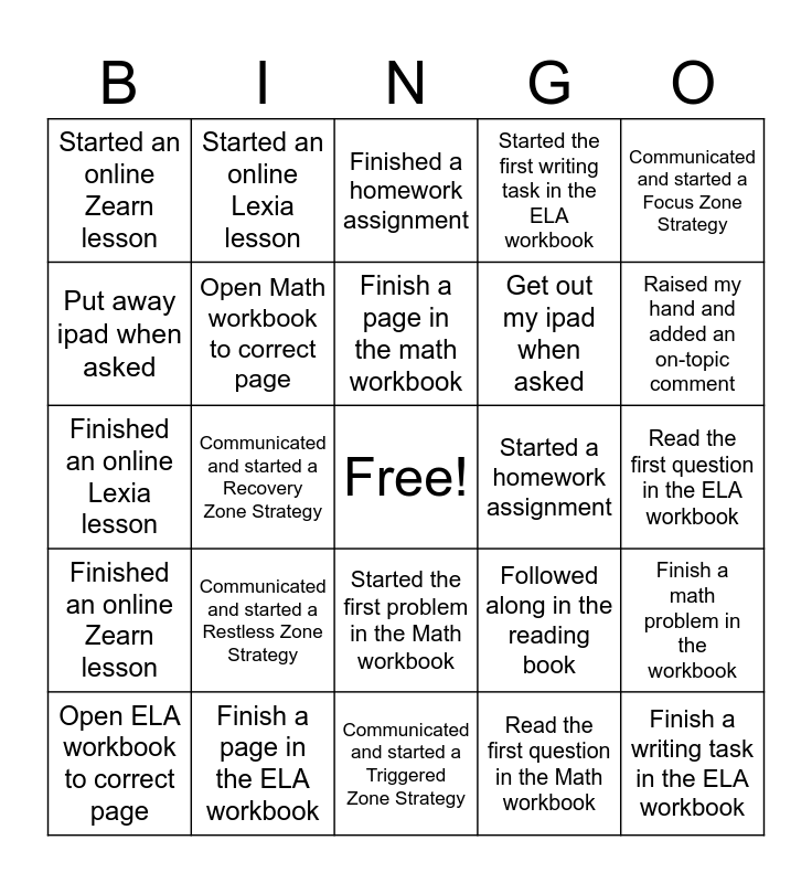 This bingo card has a free space and 24 words: Communicated and started a Restless Zone Strategy, Finish a page in the ELA workbook, Finish a page in the math workbook, Open ELA workbook to correct page, Communicated and started a Focus Zone Strategy, Started an online Zearn lesson, Put away ipad when asked, Started an online Lexia lesson, Started a homework assignment, Started the first problem in the Math workbook, Get out my ipad when asked, Finished an online Lexia lesson, Followed along in the reading book, Finish a math problem in the workbook, Open Math workbook to correct page, Read the first question in the Math workbook, Read the first question in the ELA workbook, Finished a homework assignment, Raised my hand and added an on-topic comment, Communicated and started a Recovery Zone Strategy, Finish a writing task in the ELA workbook, Finished an online Zearn lesson, Started the first writing task in the ELA workbook and Communicated and started a Triggered Zone Strategy.