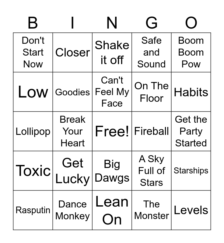 This bingo card has a free space and 46 words: Get Get Down, Levels, Party Rock Anthem, Lean On, Get Lucky, Clarity, Closer, In Da Club, Low, Yeah!, Goodies, Safe and Sound, Starships, A Sky Full of Stars, Stay The Night, Timber, Can't Feel My Face, Fireball, Levitating, Boom Boom Pow, Break Your Heart, The Monster, Don't Start Now, On The Floor, Bangarang, Habits, Rasputin, Harlem Shake, Big Dawgs, Toxic, Hey Ya!, 10:35, Don't Stop The Music, Hips Don't Lie, High Hopes, Dance Monkey, Get the Party Started, Chain Hang Low, Shut Up and Dance, Gangnam style, Dynamite, Shake it off, Lollipop, Old Town Road, Turn Down for What and Just Dance.