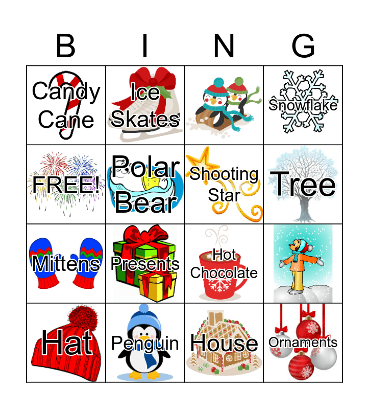This bingo card has 24 images and 20 words: Snowman, Cookies, Tree, FREE!, Candy Cane, Polar Bear, Ice Skates, Penguin, Raindeer, Mittens, Hot Chocolate, gingerbread Man, Shooting Star, Lights, House, Presents, Hat, Ornaments, Snowflake and Bells.