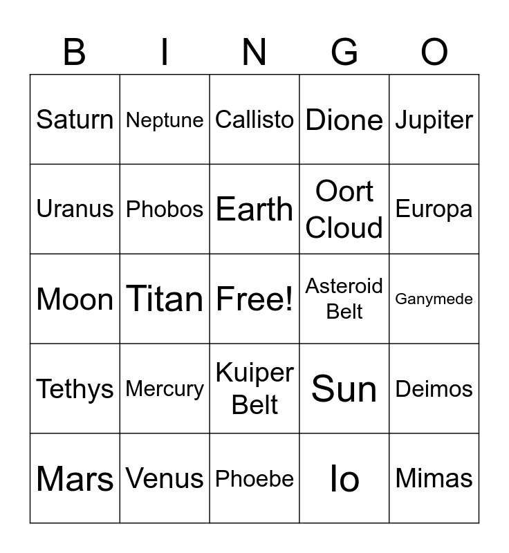 This bingo card has a free space and 24 words: Mercury, Venus, Earth, Mars, Jupiter, Saturn, Uranus, Neptune, Asteroid Belt, Kuiper Belt, Oort Cloud, Moon, Sun, Deimos, Phobos, Io, Ganymede, Callisto, Europa, Titan, Mimas, Tethys, Dione and Phoebe.